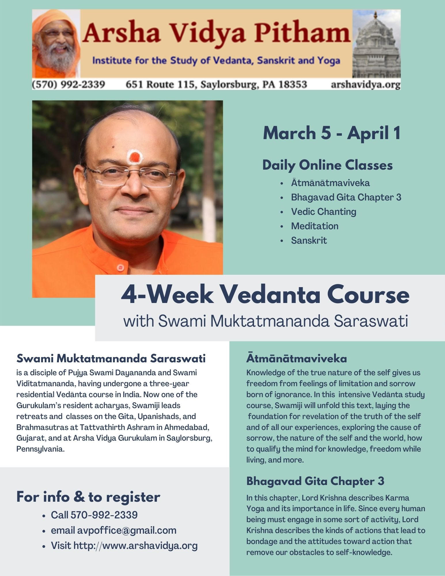 Swami Muktatmananda is at the Gurukulam as a resident acharya. He is offering in-person and online Vedanta classes at the Gurukulam.