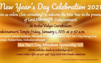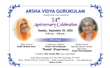 (Patrons of the Gurukulam, who pledge $2000 for the year and renewable, are entitled to select four Gifts-For-a-Day and attend one Patrons’ Retreat without any charges. They will also receive a one-time gift of special collections of Pujya Swamiji’s books)