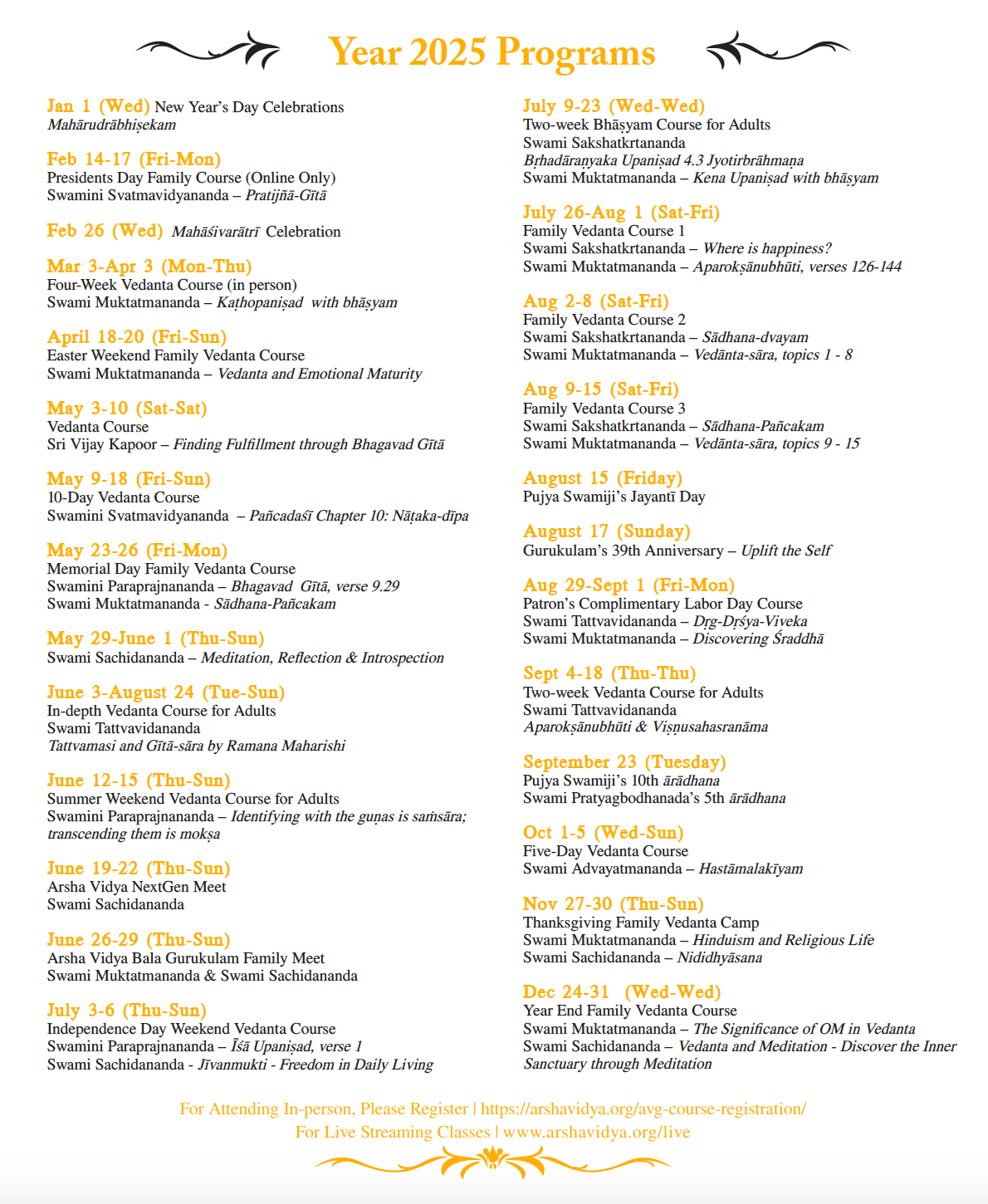 Swami Muktatmananda is at the Gurukulam as a resident acharya. He is offering in-person and online Vedanta classes at the Gurukulam.